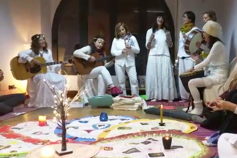 Cantamos acapella, así como acompañándonos de tambores, bongos, sonajas, shakers, shruti box, teclado, guitarras, ukelele, flautas y otros instrumentos musicales. Y las canciones elegidas están en sintonía con una rueda del año muy antigua, conectadas con los Ciclos de la Tierra y del Sol.